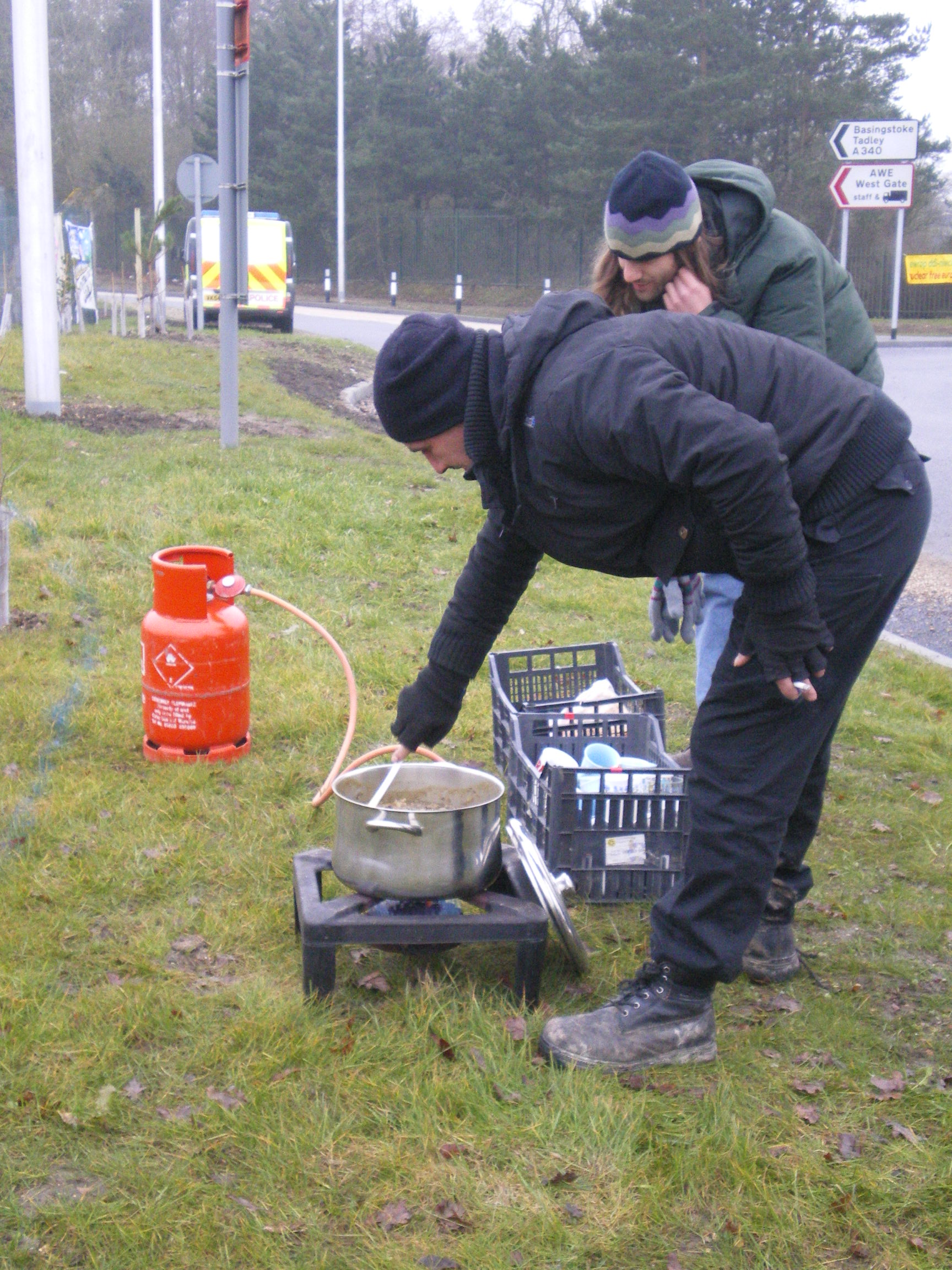 (Police tend often not to want to arrest ‘foreign nationals’ at such events as there are often bail and language problems). When it appeared that the police were happy to leave that particular blockade in place, I moved on, but not before the arrival of some spiritual and bodily support in the form of a couple of Buddhist monks swiftly followed by a mobile soup kitchen.